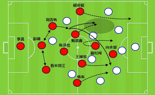 就传球脚法和控球能力来讲,彭啸是不如刘浩帆和吾米提江的,不过他的特点是处理球冷静,可以更好地去观察队友的位置。